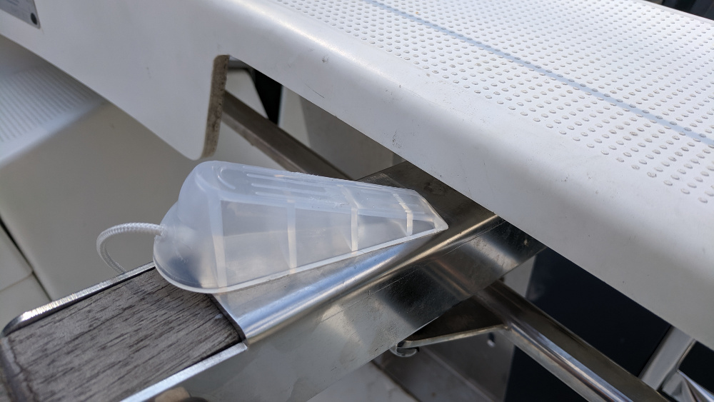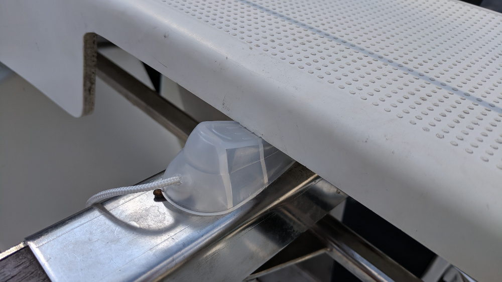 Nach langem Überlegen gibt es für die First mit ihrer besonderen Doppelruder-Konstruktion eine viel einfachere und preiswertere aber dennoch wirkungsvolle Lösung: ein gewöhnlicher Türkeil für 1,39 € aus dem Baumarkt! In der richtigen Ruderstellung wird die Pinne ein wenig nach unten gedrückt und der Keil einfach locker zwischen Pinne und GFK-Querträger geschoben. Die Spannung der Pinnenlagerung klemmt den Keil ein und verhindert dabei, dass sich die Pinne verstellen kann. Man kann die Pinne aber trotzdem sehr gut fein justieren. Über eine dünne Leine wird der Keil am Rudergestänge festgebänselt und ist so immr zur Stelle, wenn man ihn spontan benötigt. Die Fotos zeigen wie es funktioniert.